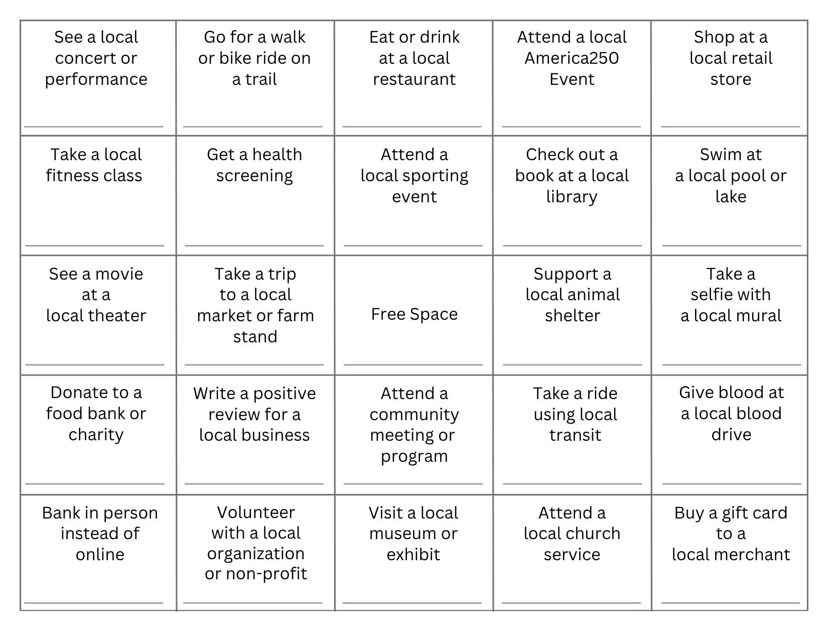 Complete 12 of the 25 squares on this postcard in the months of June and August and return it to receive a free “I ❤️Clinton County” t-shirt!